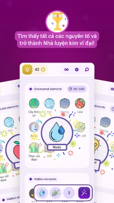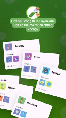 Với cơ chế chơi trực quan nhưng đầy thử thách, bạn sẽ được mời gọi khám phá qua việc kết hợp từ hai đến ba nguyên tố – đôi khi các nguyên tố có thể được sử dụng lặp lại để tạo ra những kết quả bất ngờ. Mỗi sự kết hợp mang đến một khám phá mới, từ những công thức dựa trên quy luật khoa học tự nhiên như việc Nước và Lửa giao thoa tạo thành Hơi Nước, cho đến những liên tưởng sáng tạo và thần thoại, như sự kết hợp giữa Cá và mạch nước phun kỳ ảo để tạo ra Cá Voi khổng lồ. Từ những phát minh phi thường, những loại độc dược mạnh mẽ, cho đến các sinh vật sống và hệ thực vật phong phú, tiềm năng sáng tạo của bạn là vô tận.