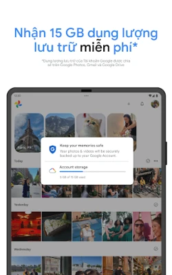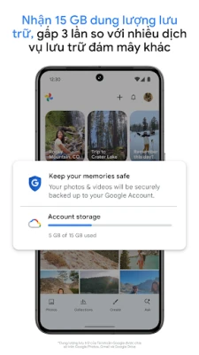 Google Photos là kho lưu trữ thông minh, nơi mọi kỷ niệm quý giá của bạn được bảo vệ an toàn và dễ dàng tiếp cận. Với mỗi Tài khoản Google, bạn sẽ sở hữu ngay 15 GB dung lượng đám mây miễn phí*, lớn hơn đáng kể so với nhiều dịch vụ khác, đảm bảo mọi bức ảnh và video được tự động sao lưu an toàn trên mọi thiết bị bạn sử dụng. Tạm biệt nỗi lo mất ảnh hay đầy bộ nhớ điện thoại – chỉ với một chạm, bạn có thể giải phóng không gian thiết bị mà vẫn giữ nguyên khoảnh khắc trên Google Photos.
