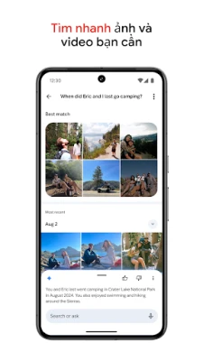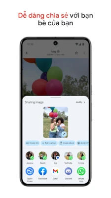 Tìm kiếm mọi khoảnh khắc yêu thích chưa bao giờ dễ dàng đến thế; chỉ cần mô tả điều bạn muốn tìm kiếm bằng ngôn ngữ tự nhiên, ví dụ như "An và tôi cùng cười" hay "Yến vẽ tranh ở sân sau". Dễ dàng sống lại những kỷ niệm đẹp nhất và chia sẻ chúng với bạn bè, gia đình, ngay cả khi họ không dùng Google Photos. Hơn nữa, Google Photos còn tích hợp Google Ống kính, giúp bạn khám phá thế giới xung quanh bằng cách nhận diện văn bản và đối tượng trong ảnh. Biến những khoảnh khắc kỹ thuật số thành hiện vật ý nghĩa như sách ảnh hay ảnh in, mang kỷ niệm từ màn hình điện thoại đến tổ ấm của bạn (dịch vụ in có ở Hoa Kỳ, Liên minh Châu Âu, Vương quốc Anh và Canada).